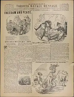 Mackenzie refused to participate in the 1852 negotiations to merge the Reform movement with the Clear Grits, a new political movement in Canada West.[178] On October 5, 1852, Mackenzie wrote a letter to the Examiner that Lesslie wanted to edit before printing. Mackenzie rejected the edits and Lesslie did not publish any of Mackenzie's letters. Losing his only way to communicate with his constituents, Mackenzie began his own newspaper on December 25, 1852, called Mackenzie's Weekly Message, which he later renamed the Toronto Weekly Message.[179] Mackenzie faced a difficult re-election campaign in 1854 for his Haldimand seat. Local newspapers complained he only came to the constituency during elections and his colleagues in the assembly had a negative opinion of Mackenzie. His positions against religious school boards caused some voters to withdraw their support. He won the election by 54 votes, a smaller majority than in the previous election.[180]