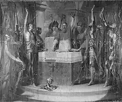 Two of Martin's pictures in St. Andrew's Hall, Norwich, The Death of Lady Jane Grey and The Death of Queen Eleanor, were engraved by F. Bartolozzi, RA, who also engraved his Imogen's Chamber. A picture of The Barons swearing the Charter of Liberties at Bury St. Edmunds, which entered the University of Oxford collection, was engraved in mezzotint by W. Ward. A Cottage Interior was similarly engraved by C. Turner, and The Confidants by J. Watson.[1]