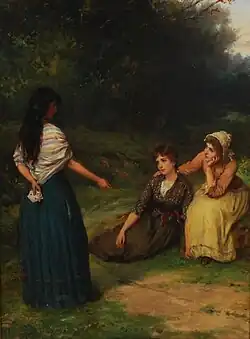After recovering from bankruptcy in 1863,[25] by the late 1860s he was based in London and had adopted his more well-known professional name which he used thereafter.[2][26] He continued to exhibit at the Royal Academy of Arts and British Institution (Tryste) in 1867, and at the Society of British Artists (The First Letter) in 1868.[2][27][28] Subsequently, he also exhibited at the Walker Art Gallery Liverpool, Manchester Art Gallery, Royal Birmingham Society of Artists and Royal Glasgow Institute of the Fine Arts.[3] His favoured exhibition venue was the Royal Academy of Arts. He exhibited 15 more works there starting with A thing of beauty is a joy for ever and Forget me not in 1867, and finishing with Mrs Oliver Williams in 1897.[2][3][29] It is recorded that at least one of his paintings had sold in one of the major auction galleries for more than £100 during the 1970–1975 period.[3]