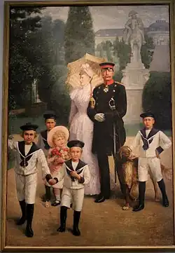 Pape was also a sought after portrait artist and was able to personally portray both the Emperor and his family several times, including, The Royal Family in Park Sanssouci: Wilhelm II, the Empress and the eldest princes..[4] He also painted portraits of many politicians, academics, artists, and aristocrats of the German Empire (many of which are held at the Berlinische Galerie),[5] including: