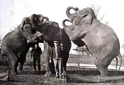 The Colonel: The Colonel, as he was known to friends (Colonel being an honorary title bestowed on auctioneers), filled his farm with dozens of animals of all kinds bought up at discount prices from failing or defunct circuses all over the US. It was said a child in Schuyler County didn't have to run away to join the circus, because the circus had run away to them.[11] Camels, lions, bears, and especially elephants were housed in giant barns and paddocks, while surplus circus wagons and other equipment dotted the landscape awaiting resale. Between 1905 and 1915, Colonel Hall was one of the largest importers of elephants from India and at times as many as thirty could be found on the Lancaster property.[12] With the outbreak of World War I in 1914, his old business associates the British army again came calling.[13] A substantial percentage, perhaps as high as seventy, of the British and Canadian armies' horses and mules came from Colonel Hall's animal brokering.[14] On the home front, Hall figured out that sometimes selling animals and equipment wasn't always the best option. He established a leasing and rental business that proved highly profitable. Often, when a startup circus would go bankrupt, Hall would get not only his leased items and animals back, but the rest of the failed business's assets as payment, which he in turn could lease out again for still more profit. Big or small, a huge number of American circuses, including major names like Ringling Brothers and Cole, had dealings with Hall.