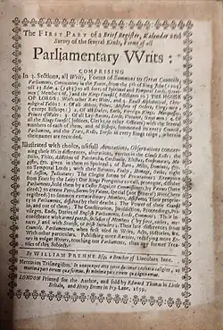 The title page of Prynne's The First Part of a Brief Register, Kalendar and Survey of the Several Kinds, Forms of All Parliamentary VVrits (1st ed., 1659).[34] Prynne went on to publish another three parts in 1660, 1662 and 1664.
