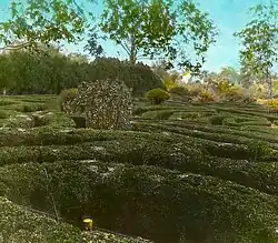 A 1936 view from the schoolhouse of boxwood maze, which was destroyed in the 1970s by blight. A path lined by boxwood plants was created along the former maze's perimeter.[6]