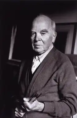 In 1958 Roberts was elected an Associate of the Royal Academy, and two years later, when he turned 65, he retired from his one-day-a-week teaching position at the Central School. However, his output as an artist over the next fifteen years remained prolific. In 1961 he was given an award by the Calouste Gulbenkian Foundation "in recognition of his artistic achievement and his outstanding service to British painting".[48] In that same year he began painting The Vorticists at the Restaurant de la Tour Eiffel, Spring 1915 (completed 1962; now in the Tate Gallery), a nostalgic recollection of a boisterous Vorticist gathering in 1915 that can be read as an attempt by Roberts to build bridges following the "Vortex Pamphlets" debacle. A major retrospective of his work, organised by the Arts Council of Great Britain and curated by Ronald Alley, opened at the Tate Gallery in 1965, and a smaller version was also shown in Newcastle and Manchester. In the same year Roberts was offered, but rejected, an OBE.[49] He was, however, pleased to be elected a full member of the Royal Academy in 1966.[50] While still tackling a variety of subjects, Roberts became somewhat obsessed with the self-portrait, and a number of his self-portraits would be exhibited by the National Portrait Gallery in 1984.[51]