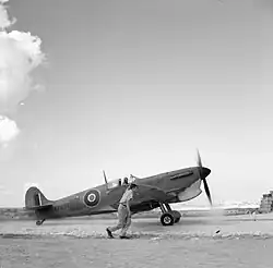 In late June Rolls was posted to RAF Debden in preparation for a posting to Malta, where he was to join part of the island's aerial defences.[9] He was involved in testing whether a Spitfire could be flown off the deck of an aircraft carrier, HMS Furious; his suggestion of fitting a hydromatic propeller proved crucial to the aircraft's ability to achieve the feat.[10] Furious subsequently carried a load of Spitfires and pilots, Rolls among them, for reinforcement of Malta's fighter squadrons, sailing from Greenock in Scotland in late July, bound for Gibraltar.[9] The aircraft carrier departed Gibraltar on 10 August and the following day, Rolls led a flight of seven Spitfires off the deck of the aircraft carrier and onto Malta.[11] He was posted to No. 126 Squadron and was soon in action; on 13 August while patrolling over a shipping convoy during Operation Pedestal, he was credited with destroying a Junkers Ju 88 medium bomber that was attacking the oil tanker SS Ohio. However, aviation historians Christopher Shores and Clive Williams note that this may be a half share, as it is possible that the commander of the squadron, Squadron Leader Bryan Wicks, inflicted damage on the Ju 88 as well.[5][12] Later in the month, Roll was made a flight commander in the squadron.[13]