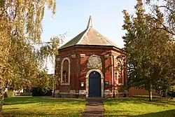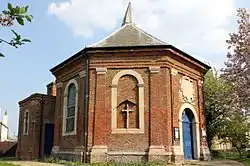 - Moulton Chapel, St James Moulton. The original church is brick and octagonal in form. Each side of the octagon has a pair of giant pilasters of the Doric order, similar to the pilasters on the façade of Fydell House. The doorway and widows are arched and the interior has a domed roof. A baroque date inscription is present. The Spalding Gentlemen's Society has a drawing by John Talman showing that the architect had originally intended to surmount the building with a cupola.[5] It can be compared with the less ornate octagon Presbyterian and later Unitarian Octagon Chapel of 1756 in Norwich, which is thought to have been inspired by the architecture of the Low Countries.[6]