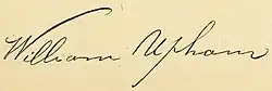 William Upham was born in Leicester, Massachusetts, on August 5, 1792, a son of Samuel Upham and Martha "Patty" (Livermore) Upham.[1] He moved with his family to Montpelier, Vermont, in 1802.[2] Upham worked on his family's farm and attended the district schools until age 15, when he sustained an injury after catching his hand in a cider mill; all the fingers of his right hand were crushed, resulting in the amputation of his whole hand, including the fingers and palm.[2] Upham then followed an academic course with the intent of pursuing a professional career, and attended Montpelier Academy and classes with two private tutors.[2] He attended the University of Vermont, then studied law, first with Cyrus Ward, then with Samuel Prentiss.[2][3] In 1835, the university awarded Upham the honorary degree of Master of Arts.[4]