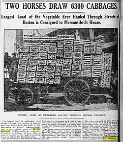 3. ^ a b c d "TWO HORSES DRAW 6300 CABBAGES". The Boston Globe. May 27, 1909. Retrieved December 24, 2024 – via Newspapers.com.