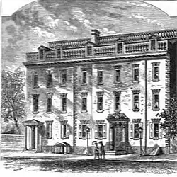 This family dwelling-house was in its day—indeed, still is—a noble specimen of English architecture a century ago. It is a brick edifice, fifty feet in front, and three stories high, built with Holland bricks relieved by brown stone watertables, lentils and jams, (sic) with walls as substantial as many modern churches, standing along the south side of Pearl-street, formerly called Queen Street. The superb staircase in its ample hall, with mahogany handrails and bannisters, by age as dark as ebony, would not disgrace a nobleman's palace. It is the only relic of the kind, that probably at this period remains in the city, the appearance of which affords an air of grandeur not to be seen in the lighter staircases of modern buildings.