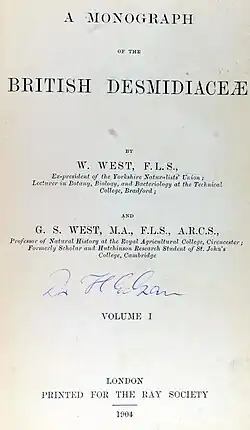 After that, West collaborated with his son George Stephen West on publications on the subject of phycology, especially freshwater algae.[12] "The two Wests became experts in this field – their studies leading to A Monograph of the British Desmidiaceae".[5] The first volume of that series was promptly purchased in October 1904 by Thomas W. Hand, city librarian for Leeds Public Free Libraries, and catalogued as no. 589.61.[20] W. Denison Roebuck commented:[10]