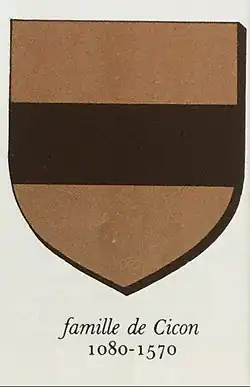 An ancestor of Cicon's had been with the Fourth Crusade that had sacked Constantinople in 1204, one Othon de Cicon. Othon de Cicon had accompanied his uncle Othon de la Roche (who became Duc d’Athènes and built a Frankish tower atop the Acropolis) on the fourth crusade, and became lord of Karystos from 1250 (at least) to his death around 1266.[1] Guillaume de Cicon's first arrival in the English record of 13 November 1276 follows closely on the heels of the recapture of Karystos by the Byzantines under Licario also in 1276.[2]