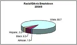 As of the latest reporting (SY-2004/5) the racial/ethnic breakdown for district students is: 1.5% American Indian/Asian/Pacific Islander; 6.3% Black; 3.5% Hispanic; and 88.7% White (non-Hispanic).