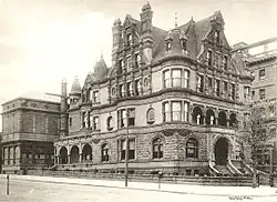 Widener's city house was one of the most notable in Philadelphia. An ornate Flemish-style eclectic design in highly-wrought brownstone and brick, it had a 53-foot (16.2 m) facade on Broad Street and a 144-foot (43.9 m) facade on Girard Avenue. The over-the-top interiors were decorated by George Herzog, and included buxom nudes as newel posts, walls embellished with alabaster and bronze, and murals of the Widener children in Renaissance dress.[3] Almost an anachronism when completed in 1887, the family lived there only a dozen years before building a sedate neo-Georgian palace in the suburbs: Lynnewood Hall. The city house served as a branch of the Free Library of Philadelphia, 1900–1946; the offices of an architectural firm, and in 1970 became the Conwell School of Theology's Institute for Black Ministries.[4] It suffered a catastrophic fire in 1980, and was demolished.