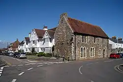 Across the road from the churchyard stands the Court Hall, one of Winchelsea's oldest buildings, the lower floor once being the gaol.[7] The first floor is now a museum, full of relics of the history of Winchelsea, the Corporation, and a model of the town. Nearby is the town well, dug in 1851 to save water being carried up the hill. It is thought to be 80 feet deep.[8] At the foot of Strand Hill stands the town workhouse Strand House just behind the port area of Winchelsea which runs along the river bank on the far side of the main road. This area contains the remains of several old buildings, such as the Old Malt House and Appletree Wick while Strand House itself was built around 1425 according to dendrochronology. These buildings made up the workhouse of the parish of Winchelsea being known as "The Old Poor Houses".[9] The area was a subject of archaeological investigation in 2013 which found the remains of the medieval wharf and a medieval boat next to the Bridge Inn.[10]