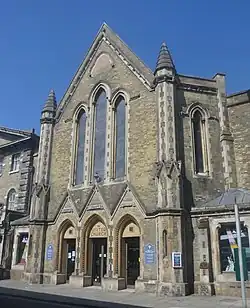 A congregation of Presbyterians formed in Winchester in the late 16th century and opened a chapel on Parchment Street in 1704. This was rebuilt in 1807. Over time the theological outlook of the church changed: it became an Independent church and then became associated with Congregationalism.[2] In 1852 a site on Jewry Street was chosen for a new chapel building. It formed part of the site of the old jail,[2] which had been replaced by a new building (now HM Prison Winchester) on Romsey Road in 1850.[3] Much of the structure of the old jail, a "forbidding" building rebuilt c. 1805, survived, and the new church was built between the remaining sections—the five-bay main entrance (now a pub called The Old Gaolhouse) and the north wing (now a shop)—"oddly separat[ing]" them.[3] The new church opened on 11 October 1853,[2] and the old chapel on Parchment Street was taken over by the Primitive Methodist Church. They rebuilt it in 1903.[4]
