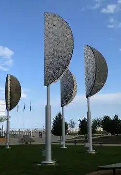 Wind Leaves is a public artwork by American artist Ned Kahn located on the downtown lakefront Pier Wisconsin in Milwaukee, Wisconsin, United States. It was created in 2006 and consists of a series of seven 30 ft (9 m) tall structures made from aluminum and stainless steel.[1] The structures, which move with the wind, have leaf forms at the top covered by thousands of stainless steel disks.