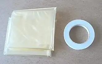 A typical window insulation film kit, consisting of plastic shrink film (folded-up) and a roll of double-sided tape