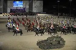 - ...a celebration of the capabilities of today’s forces through music and action. It is a tri-service event and has a packed programme of international and British military acts, massed bands, pipes and drums, modern military re-enactments and a fantastic finale.....The Tattoo tells the story of modern life in each of the services (the Army, the Royal Air Force and the Royal Navy) and large screens show footage from each of the services in action in war zones, taking the audience to the current operational environment.[3]
