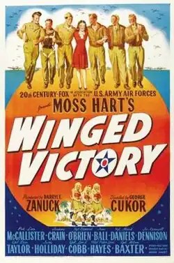 Winged Victory is a 1944 American drama film directed by George Cukor, a joint effort of 20th Century-Fox and the U.S. Army Air Forces.[2] Based upon the 1943 play of the same name by Moss Hart, who also wrote the screenplay, the film opened only after the play's theatre run. The film version of Winged Victory used many of the Broadway cast, who were brought to Hollywood.[3]