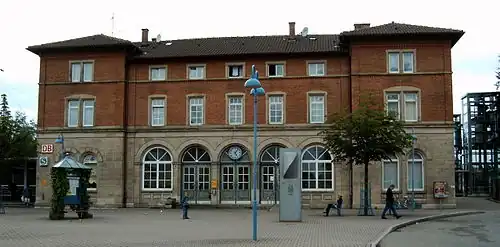 In front of the station there are several park and ride parking spaces, a station kiosk, bicycle parking spaces and a taxi rank.[4] A Deutsche Bahn Travel Center and toilets are located on the ground floor of the entrance building. Rental apartments are provided on the upper floors.