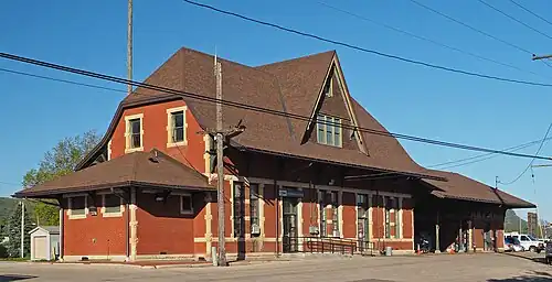Winona also had a Chicago and North Western Railroad depot that was located at 2nd and Huff.[7] It was a two-story brick station, "mildly Queen Anne in style"[7] Originally built in the late 1880s for the Winona and St. Peter Railroad at the loop where the Winona Rail Bridge crossed the Mississippi river, it was torn down in 1980.[8] The demolition of this depot building was a motivation for the Winona Heritage Association to partner with the Milwaukee Road to restore the remaining station.[6]