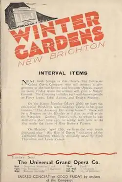 In the 1920s a number of plays premiered there before heading to the West End including Dorothy Brandon's Araminta Arrives in 1921 and Joseph Jefferson Farjeon's Number 17 in 1925. In February 1927 Edgar Wallace's hit play The Terror appeared at the Winter Gardens before heading to a lengthy London run.[2]