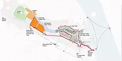 Plans for the Street Car were first announced in February 2013, intending to redevelop part of the abandoned Birkenhead Dock Branch route into a tram system.[3] The plans involved connecting Wirral Waters to the Merseyrail network at the Birkenhead North and Hamilton Square stations, utilising the stretch of dock branch trackbed along Beaufort Road and Corporation Road, with inner and outer loops around Vittoria Dock and East Float, respectively.[4][5] Options to connect this new system to Conway Park and Birkenhead Park stations are also available, along with a further extension for the Wirral Tramway to Seacombe ferry terminal.[4]