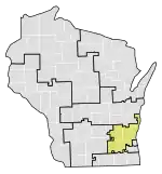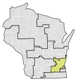 From 1965 to 2003, the district included most of the western and north-western suburbs of Milwaukee. In its final configuration, it contained all of Washington and Ozaukee counties, most of Dodge and Jefferson counties, the northern and western halves of Waukesha county and the eastern parts of Sheboygan county, including the town itself.[1] It was usually the most Republican district in the state, voting 63% to 34% for George Bush over Al Gore at the 2000 election.[2] The district was also the longest in the state (as well as the last) to be represented by a member of the Wisconsin Progressive Party however, when the party briefly surged to dominate Wisconsin’s politics during the 1930s, being represented by Merlin Hull for twelve years until 1947, when he switched to the Republican Party. At the time, the district covered much of the far western part of the state.