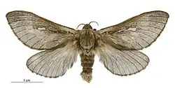 The wingspan is 34–40 mm for males and 43–52 mm for females. The colour of the forewings varies from dark to pale brown. The hindwings are pallid to infuscate.[7] W. copularis has variable wing patternation and is visually very similar to four other species within the genus Wiseana.[8][9] It is possible to distinguish the male of W. copularis by the long rectangular antennal pectinations of the adult moth.[7] However the recommended technique to distinguish specimens down to species level is through microscopic examination of the genitalia of the species or alternatively mitochondrial DNA analysis.[8][9]