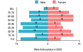According to the 2002 Poland census, there were 167 people residing in Wola Kiełczyńska village, of whom 51.5% were male and 48.5% were female. In the village, the population was spread out, with 19.8% under the age of 18, 34.1% from 18 to 44, 21% from 45 to 64, and 25.1% who were 65 years of age or older.[1]