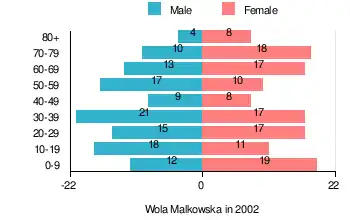According to the 2002 Poland census, there were 244 people residing in Wola Malkowska village, of whom 48.8% were male and 51.2% were female. In the village, the population was spread out, with 23.4% under the age of 18, 32.4% from 18 to 44, 17.2% from 45 to 64, and 27% who were 65 years of age or older.[1]