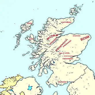 Alexander's possession of Badenoch was unaffected by the restoration of the Earldom of Moray to John Dunbar in March 1372, nor were the territories of John MacDonald, Lord of the Isles, in Lochaber—similarly with the lands of Urquhart (south of Inverness) which had been granted to David Stewart, Earl of Strathearn and King Robert's eldest son with his second wife, Euphemia.[7] Alexander further extended his territorial gains in 1371 by leasing the Urquhart lands from his younger half-brother and then obtained possession of the Barony of Strathavon bordering his Badenoch lands.[7][8]