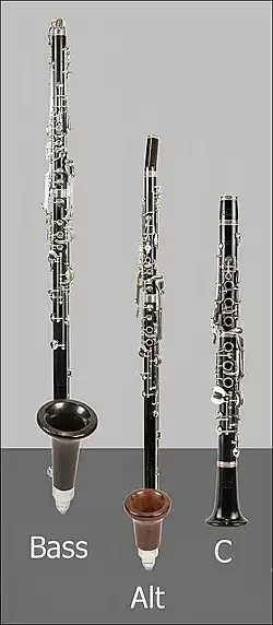 Clarinets German system: bass clarinet range to low C, E alto clarinet range to low C (!), soprano clarinet in C