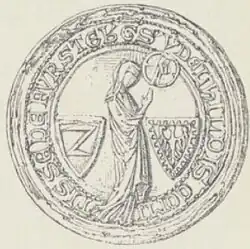 The stylised version of the Z-shaped Wolfsangel developed into a popular medieval symbol in Germany that was associated with magical powers, and was believed to have the ability to ward off wolves.[3][9] The symbol appears on early medieval banners and town seals in Germany (particularly in forested regions where wolves were present in large numbers); for example, as early as 1299 the symbol is found on seals of the Lords of the German Black Forest town of Wolfach (see opposite, the seal of the widow Countess Udilhild von Fürstenberg, the sole heiress of the Lords of Wolfach); and their Wolfsangel banner became the municipal coat of arms for the town (see opposite).[11] The symbol can be found as a medieval mason's mark.[12]