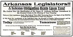 When the Nineteenth Amendment went to the states for ratification, suffragists urged their legislators to call for a special legislative session.[36] Many legislators replied promptly that they were interested in opening a special session.[36] A committee of 50 suffragists went to urge Governor Brough to call for the session.[36] He agreed, setting the date for July 28, 1919.[36] When the votes were taken, both the state House and Senate voted overwhelmingly to ratify the amendment on the same day.[36][37] Arkansas became the twelfth state to ratify the Nineteenth Amendment.[37]