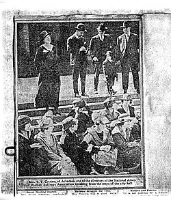 In 1889, Susan B. Anthony toured Little Rock and other Arkansas towns.[8][14] Anthony was well received by large audiences.[14] The first suffrage parade in Arkansas was held in 1890 in Little Rock.[11] In 1891, legislator E. P. Hill introduced a women's suffrage bill for "white women."[15] The bill was not successful, and was probably unconstitutional.[16] Hill again sponsored a women's suffrage bill, meant to allow women to vote for school boards, in March 1893.[16] The bill passed the Senate, but not the House.[16] A similar bill was presented by Senator Turner Butler in 1899, but again failed.[16] When McDiarmid died in 1899, the suffrage movement in Arkansas slowed down.[17] Several individuals attempted to keep the movement alive, but McDiarmid's death was a strong blow to the activists.[16]