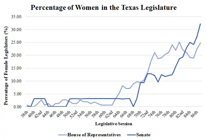 Women have been underrepresented in all three branches of Texas state government. Texas has had only two female governors over 175 years since statehood,[1] and many prominent executive positions - such as Lieutenant Governor - have yet to be filled by women. While the percentage of women in the Texas Legislature has increased over the past few legislative sessions, as of 2025, Women in the Texas Legislature hold 48 out of 181 seats in the Texas House and Senate, making 27% of the Texas Legislature female.[2] The state's highest courts – the Supreme Court of Texas and the Texas Court of Criminal Appeals – have seen similarly low numbers of female justices making up 22.2%.[3][4] Additionally, women are not only continuing to make progress in the Legislature, but have already taken steps in helping run government agencies.