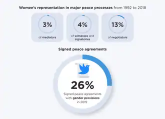 According to Neville Melvin Gertze of Namibia, speaking at an October 2019 meeting of the United Nations Security Council, peace agreements that are the result of negotiations including women are 35 percent more likely to last at least 15 years than those which are the result of men-only negotiations. At the same meeting, United Nations Secretary-General António Guterres stated that women were excluded from peace processes, attacks against women human rights defenders had increased, and only a "tiny percentage" of funding for peacebuilding was given to women's organisations.[19]