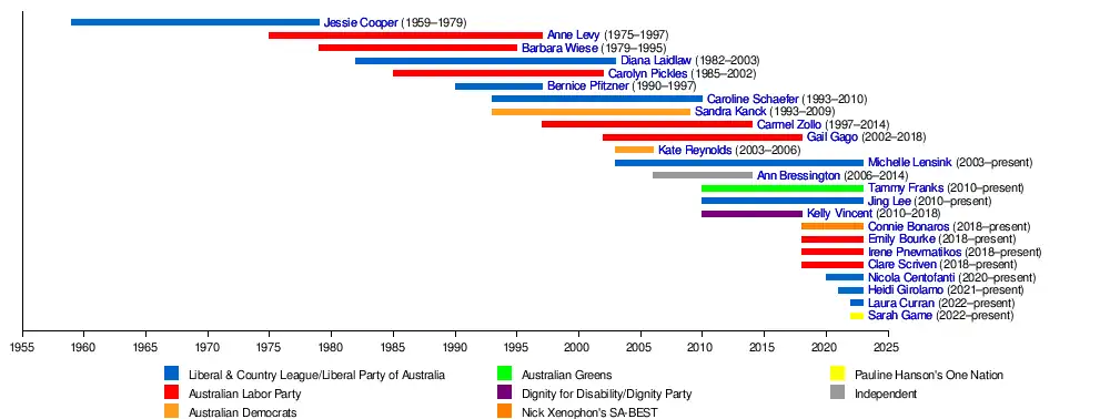 | 10 | Gail Gago | Labor | 9 February 2002 – 17 March 2018 (retired) |