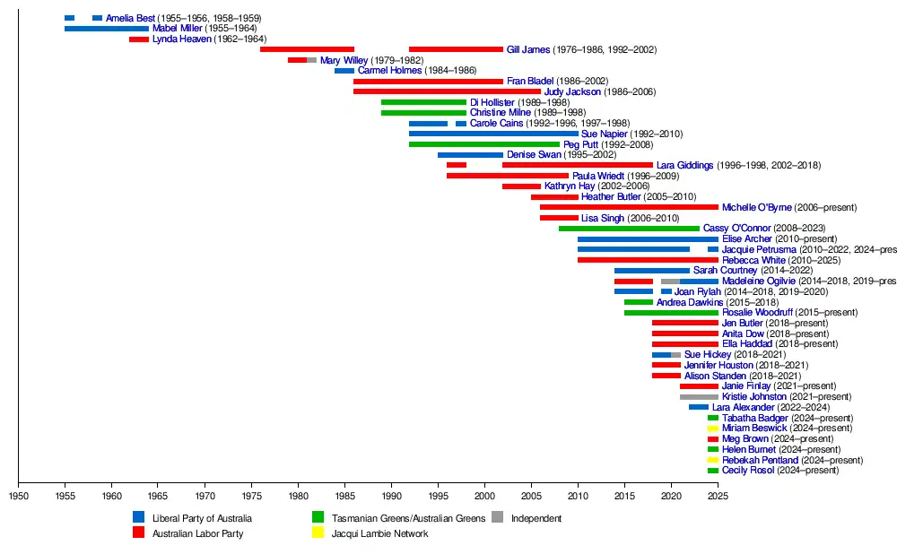 | Rebecca White | Labor | Lyons | 20 March 2010 – 12 February 2025 (resigned) | |