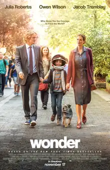 Wonder is a 2017 American coming-of-age family drama film directed by Stephen Chbosky, who co-wrote the screenplay with Steven Conrad and Jack Thorne. It is based on the 2012 novel by R. J. Palacio and stars Julia Roberts, Owen Wilson, Jacob Tremblay, Mandy Patinkin, and Daveed Diggs.