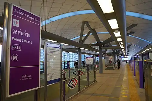 Wong Sawang station (Thai: สถานีวงศ์สว่าง, pronounced [sā.tʰǎː.nīː wōŋ sā.wàːŋ]) is a Bangkok MRT station on the Purple Line. The station opened on 6 August 2016 and is located on Bangkok-Nonthaburi road, near its intersection with Wong Sawang Road in Bangkok.[1] The station has four entrances.[2] It is the northernmost station on the Purple Line to be within Bangkok's boundary. (The next station to the north of this station is located in Nonthaburi Province).