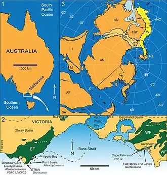 - ^ Poropat, Stephen F.; Martin, Sarah K.; Tosolini, Anne-Marie P.; Wagstaff, Barbara E.; Bean, Lynne B.; Kear, Benjamin P.; Vickers-Rich, Patricia; Rich, Thomas H. (2018-04-03). "Early Cretaceous polar biotas of Victoria, southeastern Australia—an overview of research to date". Alcheringa: An Australasian Journal of Palaeontology. 42 (2): 157–229. Bibcode:2018Alch...42..157P. doi:10.1080/03115518.2018.1453085. ISSN 0311-5518. S2CID 133845914.