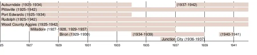 The Wood County League was founded in 1925 by five small high schools in Wood County: Auburndale, Pittsville, Port Edwards, Rudolph, and the Wood County School of Agriculture.[1] Milladore would become a member of the conference in 1927[2] but would only stay for a year before reentering in 1929.[3][4] Biron would join the Wood County League that same year,[5] bringing membership to its high of seven schools. They would only last a single season before leaving,[6] and the conference continued as a six-member loop until 1934. Two schools left the Wood County League that year: Auburndale joined the neighboring Marathon County League,[7][8] and Port Edwards became a member of the Big 7-C Conference.[9] With Biron's reentry, the Wood County League had five member schools going into the 1934-35 school year.[10] A sixth would join in 1936 (Junction City), bringing the roster back up to six schools.[11] They would only last for one season, and with Milladore's exit from the league and Auburndale's return, five schools were in the conference in 1937.[12] The number would decrease to four when Biron withdrew from the conference in 1939,[13] only to rejoin 1940[14] and leave again in 1941 after not completing their league schedule the year prior.[15] After several years of instability and the closing of the Wood County School of Agriculture, the Wood County League folded in 1942.[16] Seven years after the dissolution of the Wood County League, three former members (Auburndale, Pittsville and Rudolph) would join four schools formerly in the Marathon County League (Athens, Edgar, Marathon and Stratford) to form the Marawood Conference.[17]