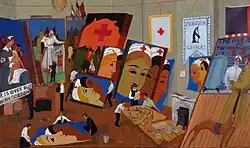In 1920, Gaylor made a dramatic painting showing members of the Penguin Club preparing posters in aid of a Red Cross bond drive (shown at right). That year, he also had two small etchings in a group exhibition at the Montross Galleries one of which drew forth from a New York Times critic a comparison Dante Gabriel Rossetti's "Genevieve" "in the purity of its medieval spirit".[21] The following year, a critic described a low-relief wood carving by Gaylor as "a gay little childish free gesture", saying, "It will be seen, and rightly, as an artist's idea triumphantly carried out".[22]