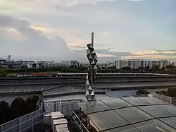A 15-metre (49 ft) high stainless steel by Min Chen is displayed at the NSL station.[31] The sculpture, Faces II, is a spiral of triangular geometric surfaces, intended to represent the various expressions of people's faces.[38] Selected among six submissions, the judges were impressed by the artist's ability to “incorporate a human feel” in a cubist style. The sculpture takes inspiration from origami, the Japanese art of paper folding. The judges hoped that the work would reflect Singapore's Asian background.[39]
