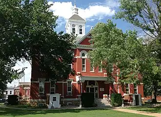 Built from 1899 to 1900, the courthouse was the second in Yates Center and replaced a wooden building moved to the city from Defiance. Architect George P. Washburn, who designed thirteen county courthouses in Kansas, designed the building; its design is similar to Washburn's Kingman County Courthouse. The brick courthouse sits on a limestone base and has a Late Victorian design which includes elements of the Romanesque Revival, Queen Anne, and Free Classical styles. The building is topped by four corner towers and a central cupola. Three of the courthouse's four entrances feature arched doorways surrounded by porches, while the north entrance has a large limestone arch around the doorway and no porch. The first and second floor windows are rectangular, while the attic windows are arched and sit atop the second floor windows; all sets of windows are connected by stone bands encircling the building.[3]