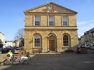 The first municipal building in the town was a medieval guildhall on the south side of Market Street which dated back at least to the 15th century.[2] It was a two-storey building which incorporated a lock-up for petty criminals and which was surmounted by a small tower with a clock and a bell.[2] By 1757, the old guildhall had become very dilapidated and it was demolished.[2] In the early 1760s, the lord of the manor, George Spencer, 4th Duke of Marlborough, approved plans for a new town hall: the site chosen had been occupied by an ancient market cross.[2] The foundation stone for the new building was laid by the duke in March 1766.[2][3] It was designed by Sir William Chambers in the neoclassical style, built by John Hooper in ashlar stone at a cost of £1,100 and was completed in 1767.[2][4]