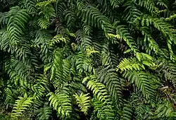 Woodwardia radicans, the chain fern,[4] European chain fern or rooting chainfern, is a species of fern in the family Blechnaceae, mainly found in Macaronesia and southwestern Europe, but is also found in southern Italy and Crete. Growing to 1.8 m (6 ft) tall by 2 m (7 ft) broad, it is evergreen with arching fronds. The pinnae have curved, finely-toothed segments. The plant derives its common name from the linked sori on the undersides of the fronds.[5][6]