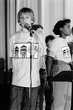With the assistance of middle school principal Larry McKinney and school board president Mark Smyth, who also owned Okemah's Crystal Theatre, the first tribute to Woody Guthrie took place on December 1, 1988. Students from Okemah, Langston, and Davenport, Oklahoma performed songs they had written with Long's help. Selections from Woody's writings were narrated by Okemah 7th grader Jerry Baker and translated into the Seminole and Creek languages by First Nation Elder Woodrow ‘Wotko’ Haney. Besides Long other featured artists included Larry's long-time musical companion Fiddlin’ Pete Watercott from California and the following beloved Oklahoma musicians: banjo virtuoso Alan Munde; gospel pianist Shirley Davis; and Okemah's own Reverend Olen Edwards on vocals and harmonica.[17] McKinney said the artist-in-resident program was a "good learning experience for his seventh grade students".[10] Long stated that the lyrics for the songs “came from students interviewing their parents, grandparents and each other. So when it came time to hold a big community celebration for Woody, it was no longer just Woody we were celebrating, but the entire community of Okemah and Oklahoma.”[18] Woody's sister, Mary Jo Guthrie Edgmon, attended the concert and later said: "I felt the warmth of my family all around me. Clara, Roy, Woody, George, Papa and Mama. They, too, all sat here in this very theatre many years ago. When the children came marching down the aisle and on the stage I swelled with pride and the tears came. I knew Woody was watching.”[18]